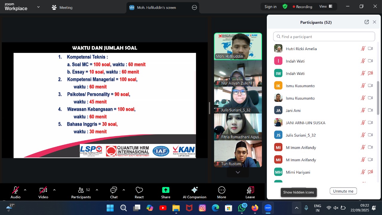 UIN Suska Riau, Senin (22/09/2025) — Sebanyak 25 peserta mengikuti kegiatan Uji Kompetensi Calon Auditor Audit Mutu Internal yang diselenggarakan hari ini di UIN Suska Riau sebagai bagian dari upaya peningkatan kapasitas sumber daya manusia dalam bidang penjaminan mutu. Kegiatan ini menjadi langkah strategis dalam mempersiapkan auditor internal yang kompeten dan bersertifikasi internasional.